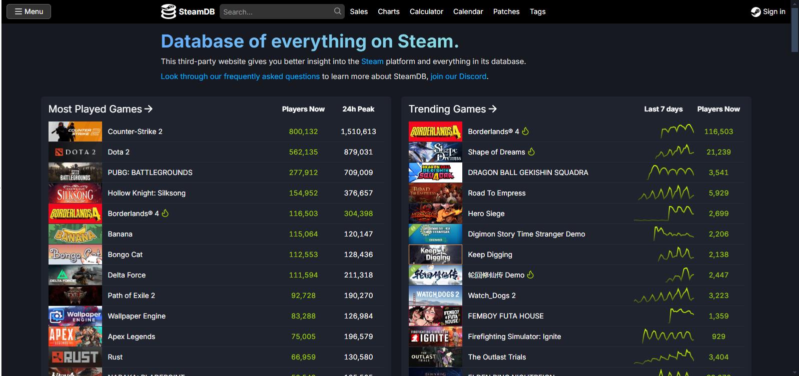SteamDB 是第三方开发者构建的实时数据库,专注于抓取、解析并可视化 Steam 平台(全球最大PC游戏分发平台)的深层数据。它弥补了Steam官方界面信息不透明的缺陷,提供远超商店页面的技术性洞察,日均处理超10亿条数据更新。